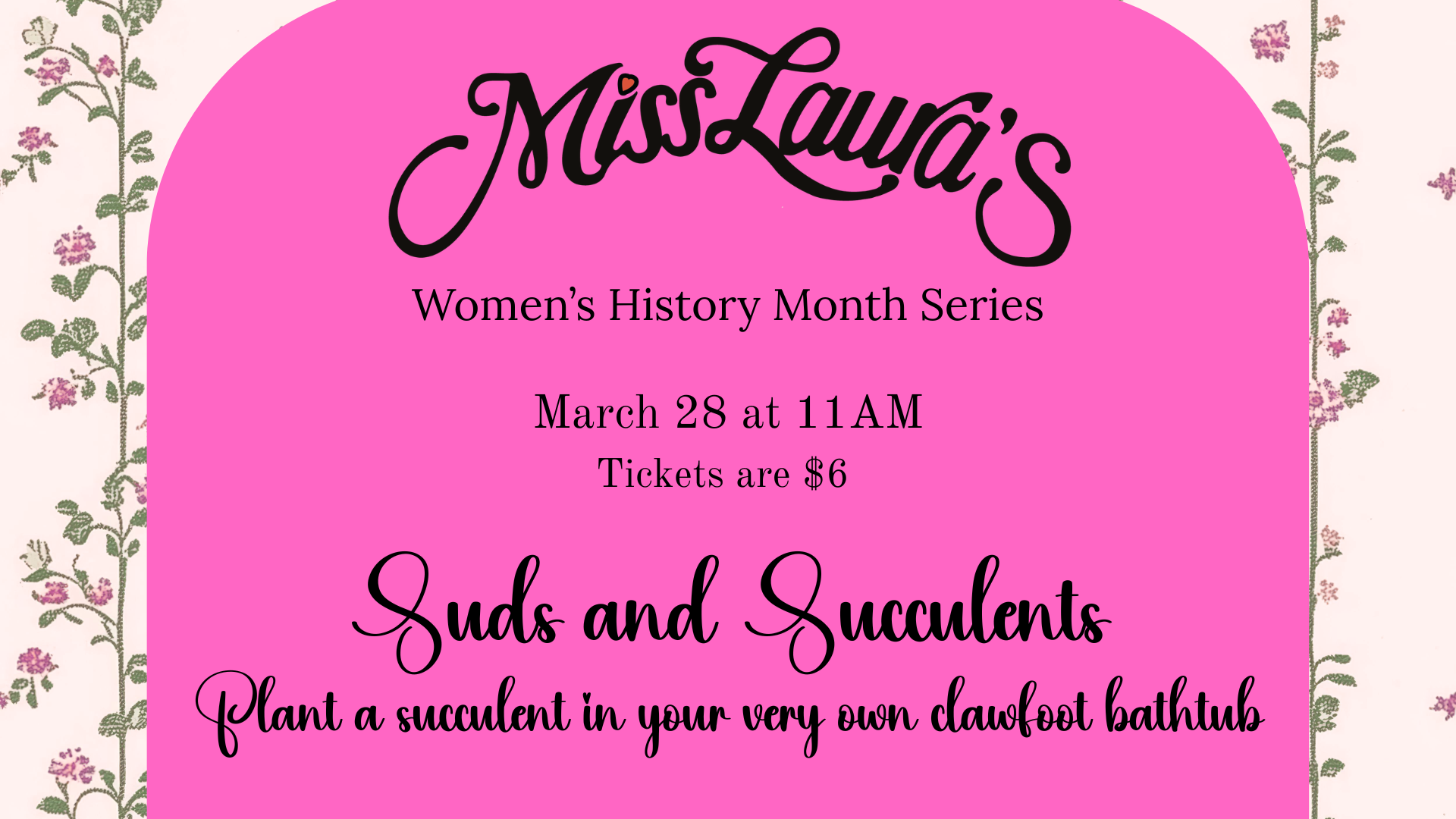 Get ready to soak up a little history and plant something beautiful! Join us at 11 AM for Suds & Succulents, a hands-on experience where you’ll plant your very own succulent inside a charming mini clawfoot bathtub inspired by Miss Laura’s iconic past.